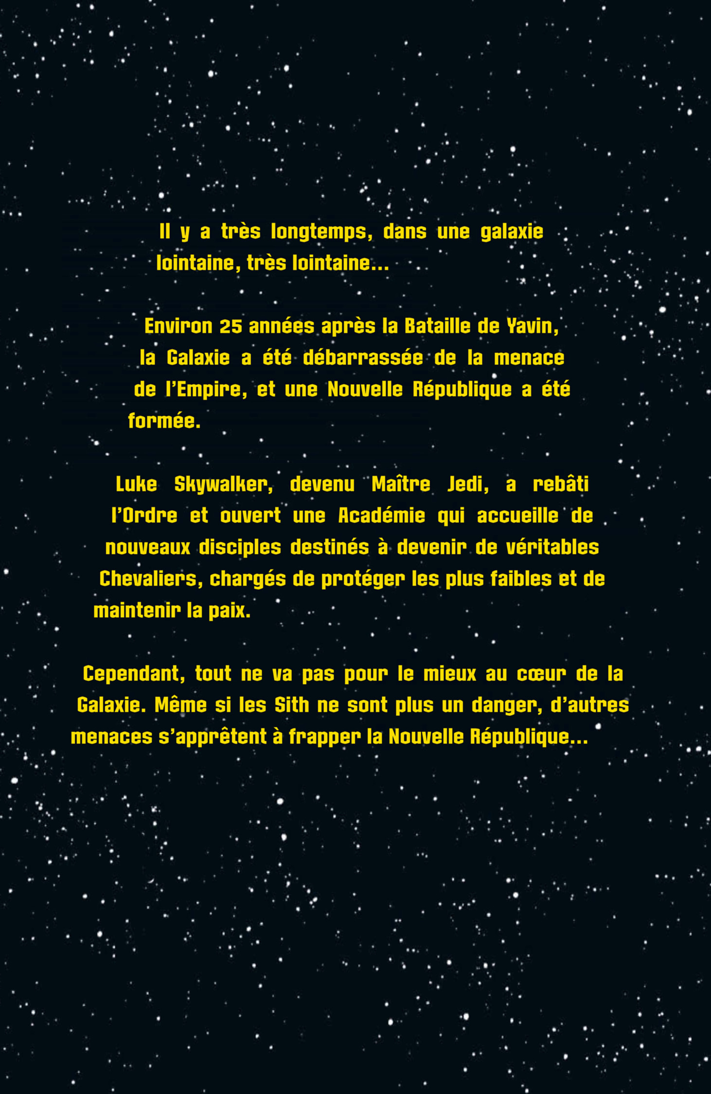 La paisible planète Artorias se trouve sur le chemin de l’armada des Yuuzhan Vong. Finn Galfridian, sa soeur Kaye et leurs parents se retrouvent séparés. Lorsque l’invasion se produit, un seul maître mot : survivre. Sans hésiter, Luke Skywalker, qui a rebâti l’Ordre Jedi, Han Solo et Leia ainsi que leurs enfants repartent au combat contre cette invasion qui menace la paix dans toute la galaxie.