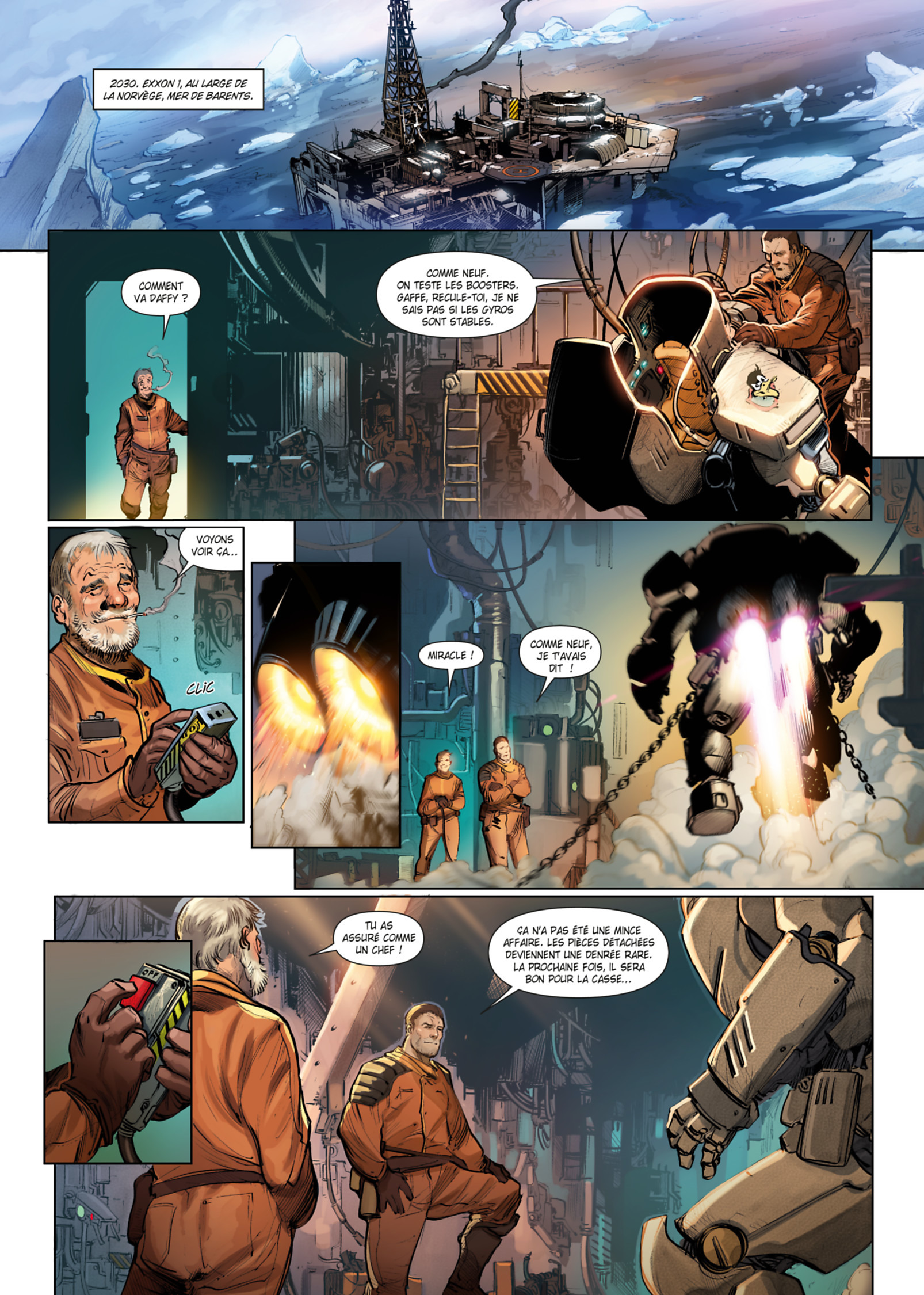 4La couverture donne le ton, ce sera donc une bd de science-fiction avec des méchas… L’histoire commence autour d’une plateforme pétrolière qui est prise d’assaut par des mercenaires, des méchas. Un seul survivant…. Ce dernier se retrouve dans le village le plus proche qui lui aussi est pris d’assaut par ces mercenaires qui se sont imposés dans les cris et le sang… Reste à savoir pour les surviv...