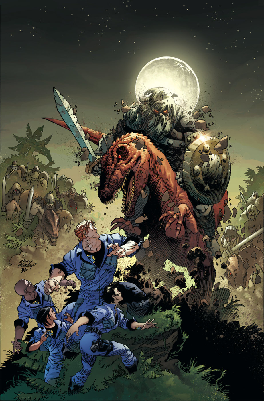 It's the New Challengers versus the Old Challengers! The original Challengers infiltrate Challengers Mountain to uncover the identity of the professor who's been manipulating both teams! As dark matter leaks from the Dark Multiverse, the New Challengers travel to the prehistoric underworld of Skartaris, stomping grounds of Travis Morgan, the Warlord!