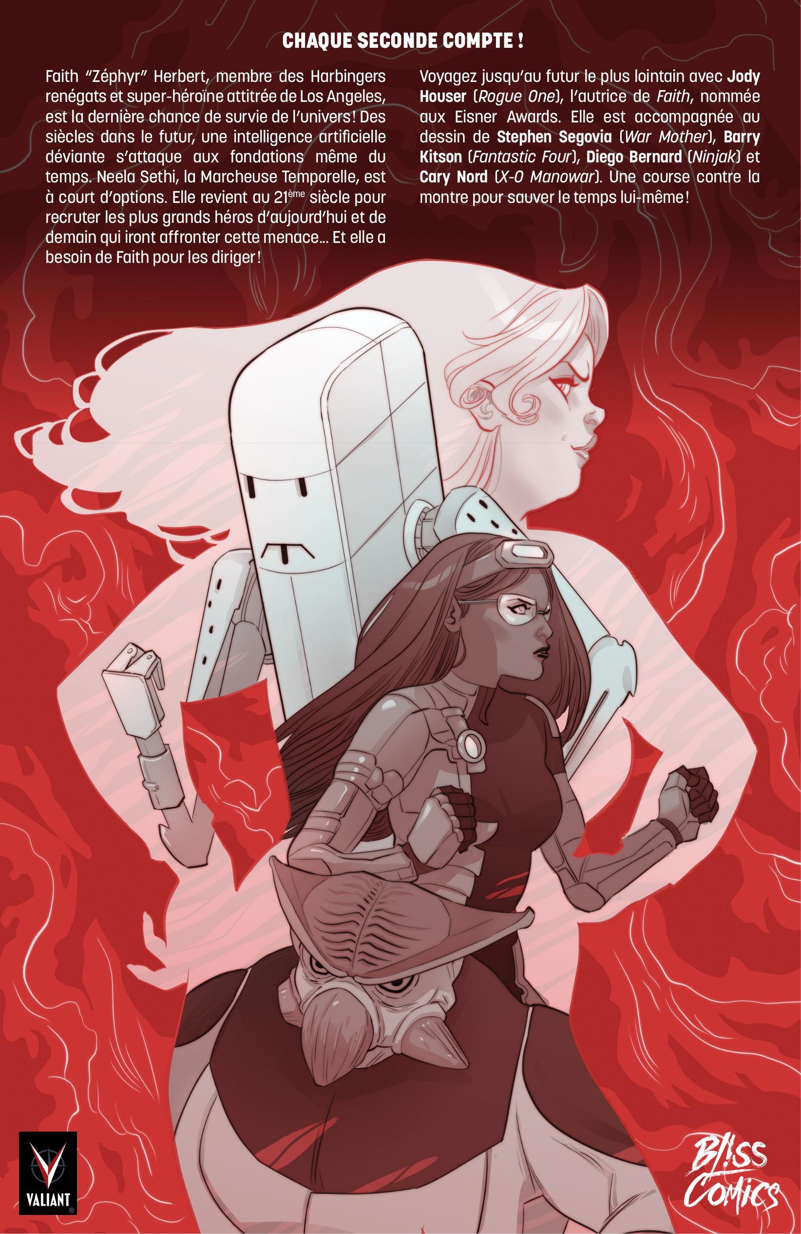 Faith “Zéphyr” Herbert, membre des Harbingers renégats et super-héroïne attitrée de Los Angeles, est la dernière chance de survie de l’univers ! Des siècles dans le futur, une intelligence artificielle déviante s’attaque aux fondations même du temps. Neela Sethi, la Marcheuse Temporelle, est à court d’option. Elle revient au 21ème siècle pour recruter les plus grands héros aujourd’hui et de demain pour affronter cette menace… et elle a besoin de Faith pour les diriger !