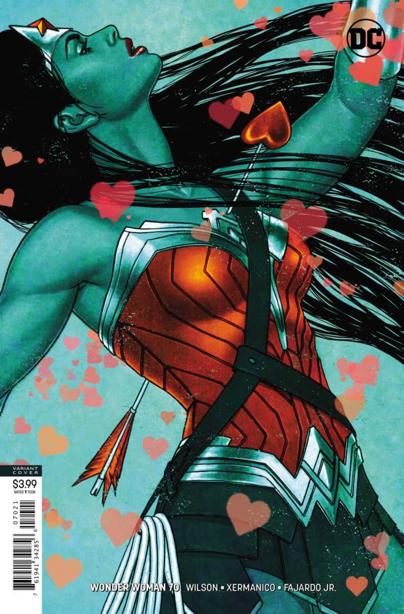Wonder Woman, Steve Trevor and the goddess of love, Aphrodite, are pretty sure they’ve found Aphrodite’s missing son in this unremarkable suburban town—the fact that everyone here is compulsively driven to act on their secret desires is an awfully big clue! But if they actually want to talk to him, they’ll have to get through a flying army of…attack cherubs?!
