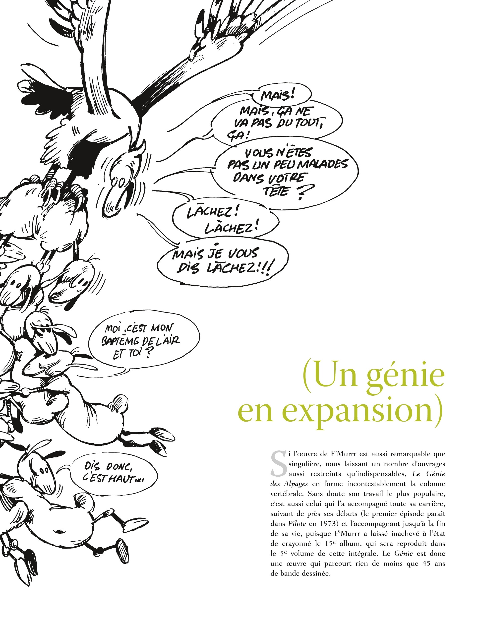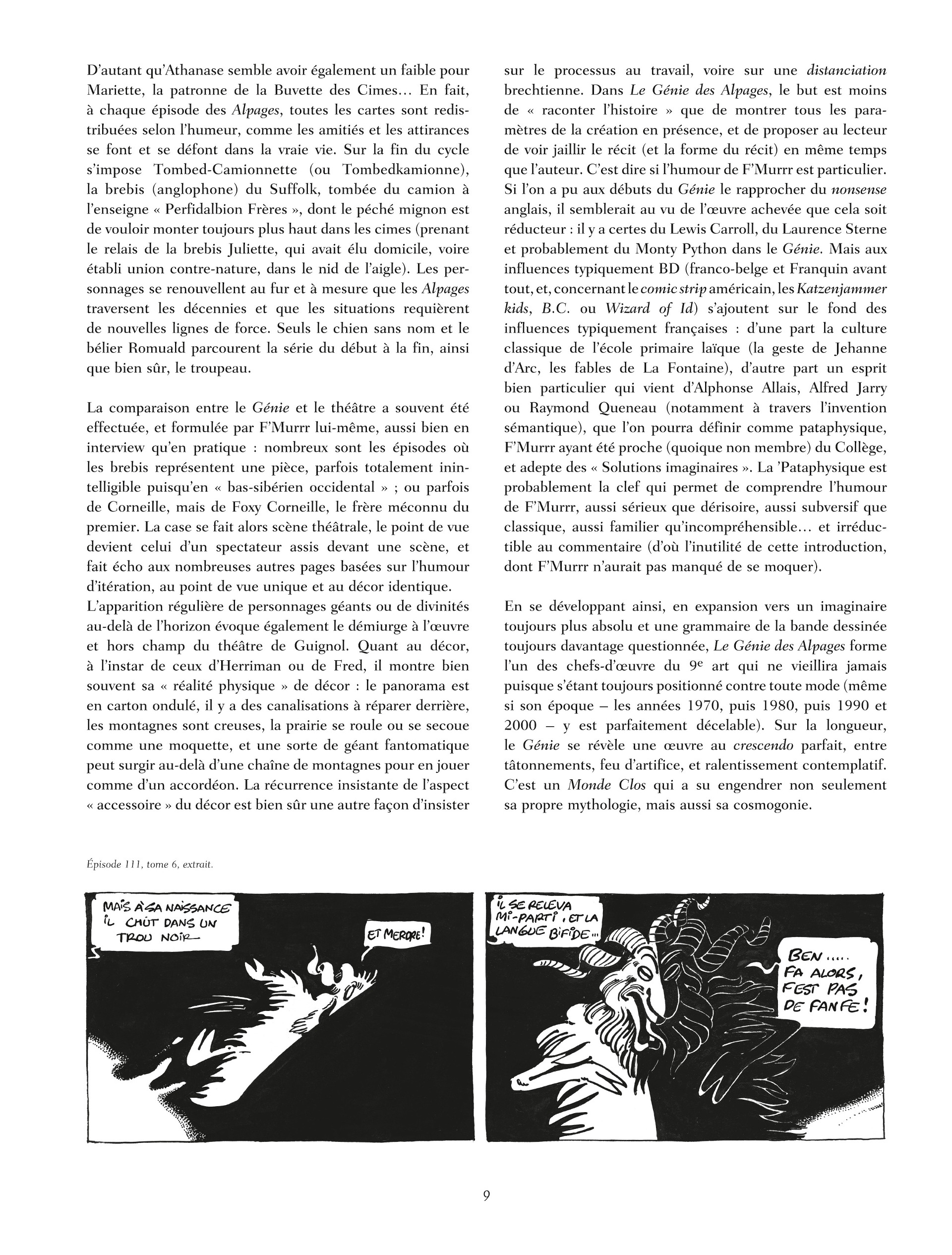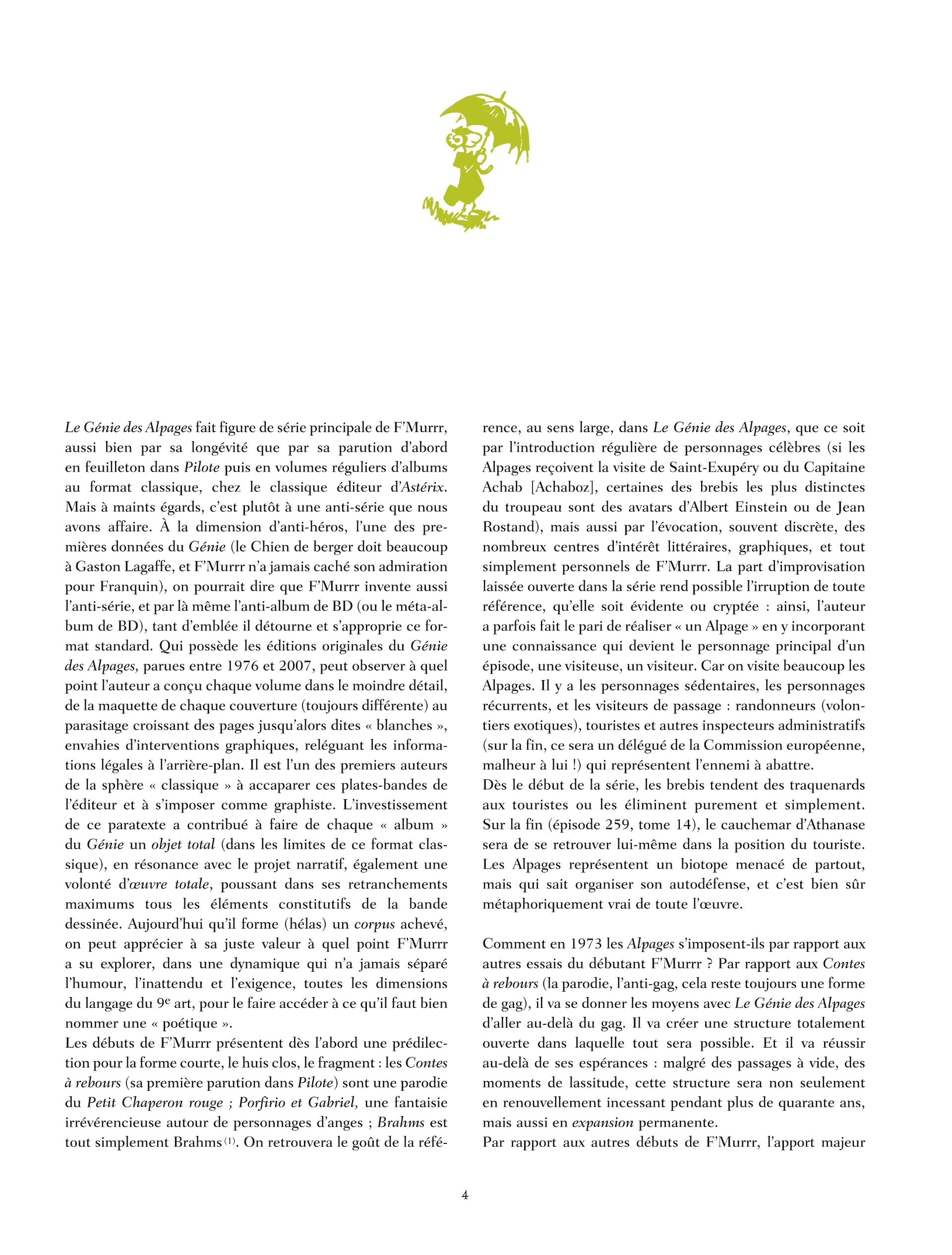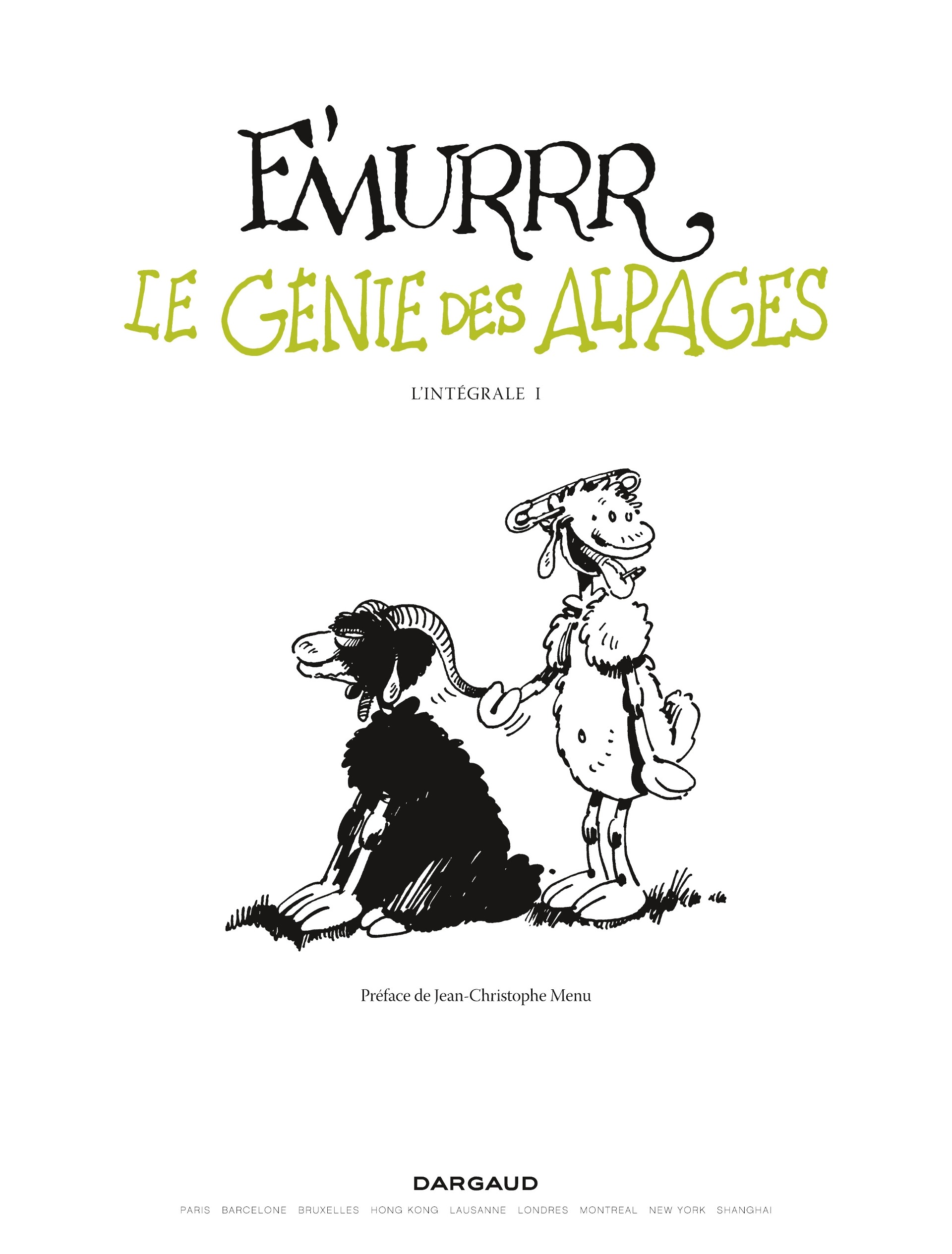 Première intégrale de la série du génial F'murr, disparu il y a tout juste un an, ce volume regroupe les trois premiers albums mettant en scène le troupeau de moutons le plus fou de l'histoire, de son berger et de son chien. Un texte de Jean-Christophe Menu éclairera le contexte et l'importance de l'apparition de cette bande dessinée, qui reste toujours une des rares réussites d'humour absurde à la française.