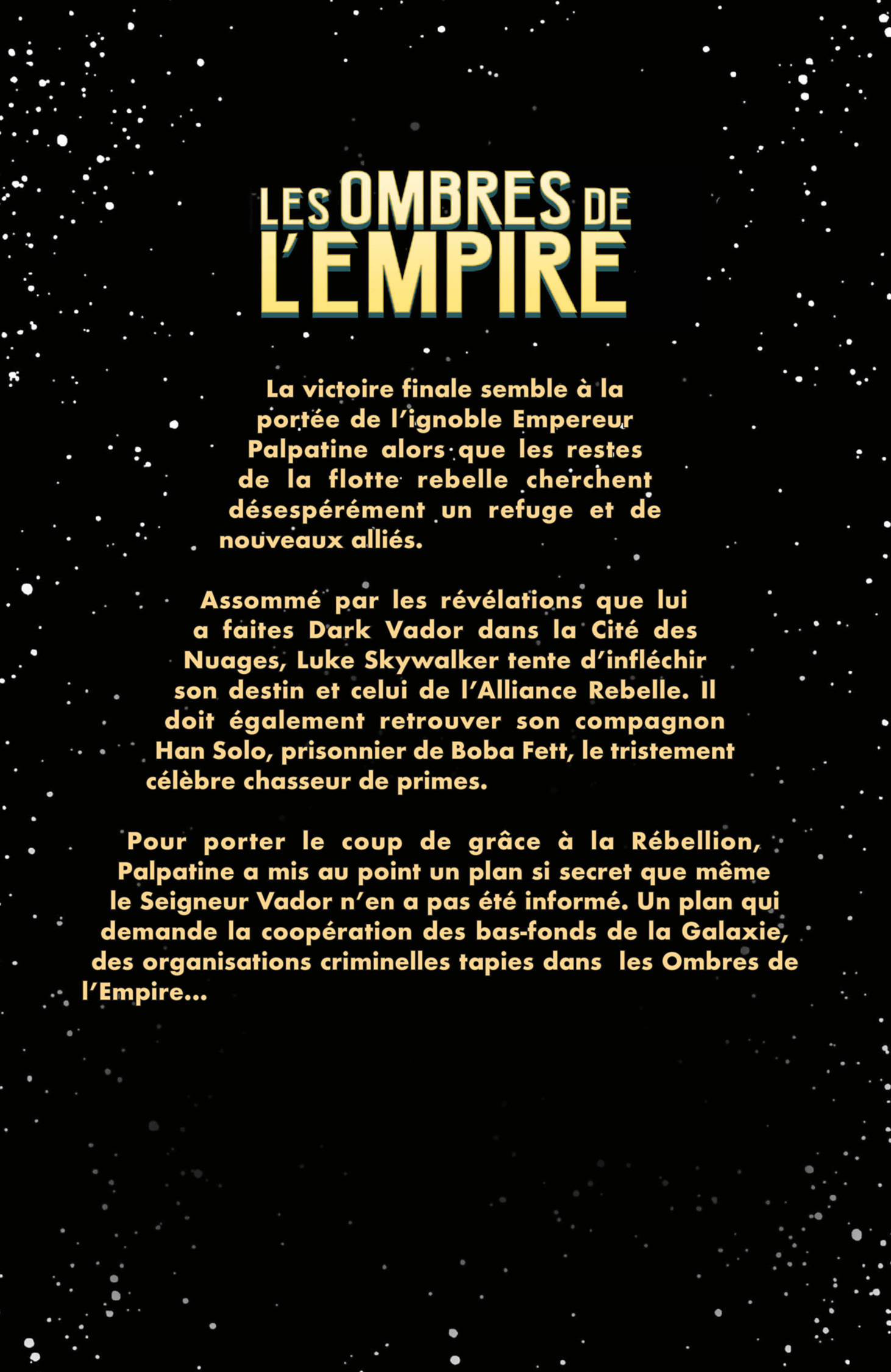 Alors que Leia Organa tente d’empêcher Boba Fett de livrer Han Solo à Jabba le Hutt, Dark Vador quadrille la galaxie à la recherche de Luke Skywalker. Mais une sinistre menace rôde en la personne du Prince Xizor, le leader d’une organisation