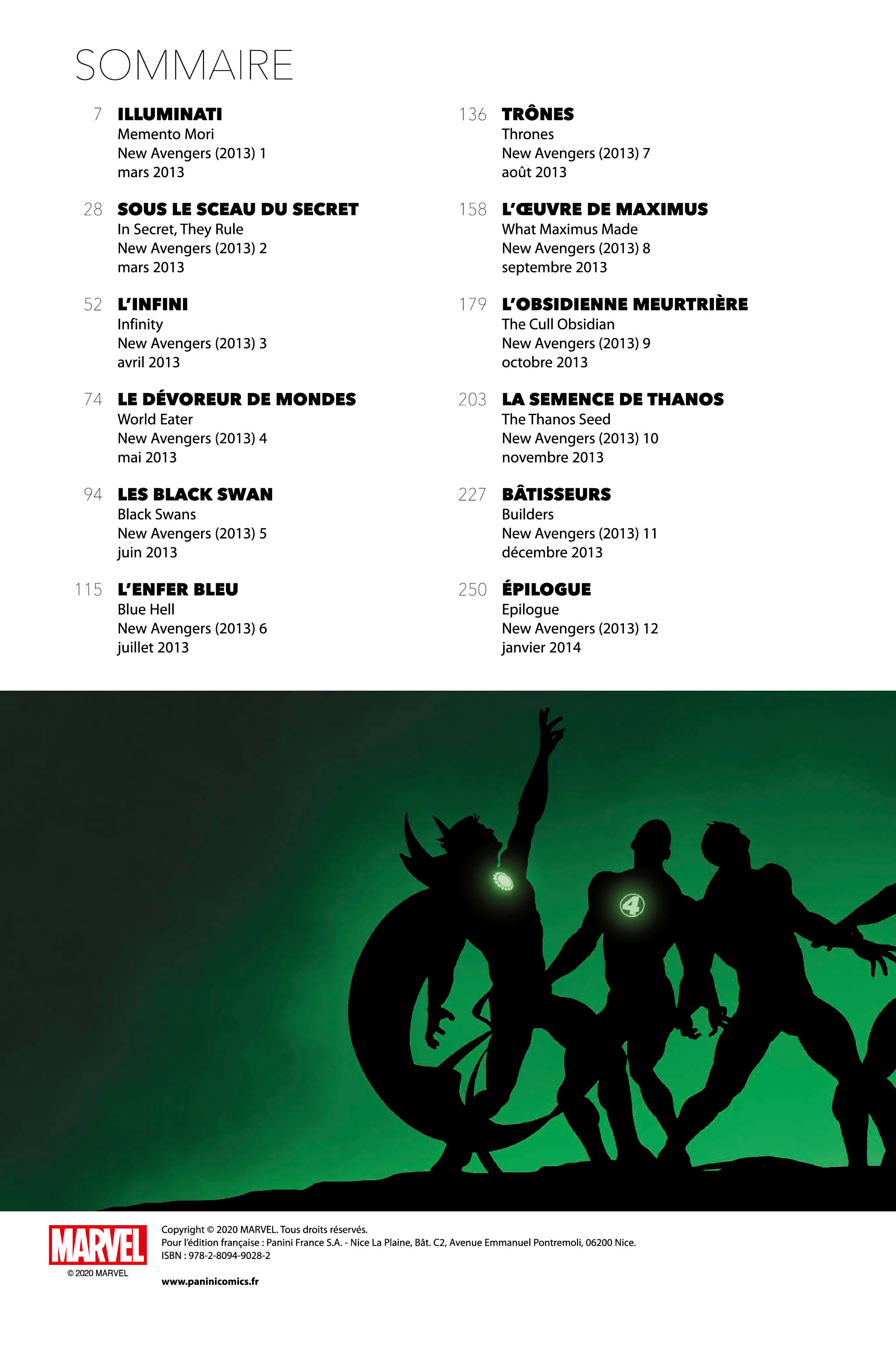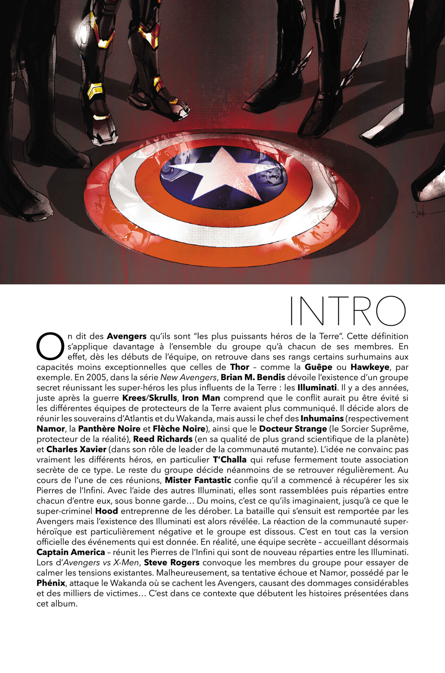 L’équipe secrète des Illuminati compte dans ses rangs les êtres les plus intelligents et les plus puissants au monde : la Panthère Noire, Iron Man, le Docteur Strange, Flèche Noire, Mr Fantastique et Namor, le prince des mers. Tandis que les univers parallèles rentrent en collision les uns avec les autres, le groupe va devoir prendre de dramatiques décisions afin de protéger la Terre. Et si les Pierres de l’Infini ne leur étaient d’aucun secours ?