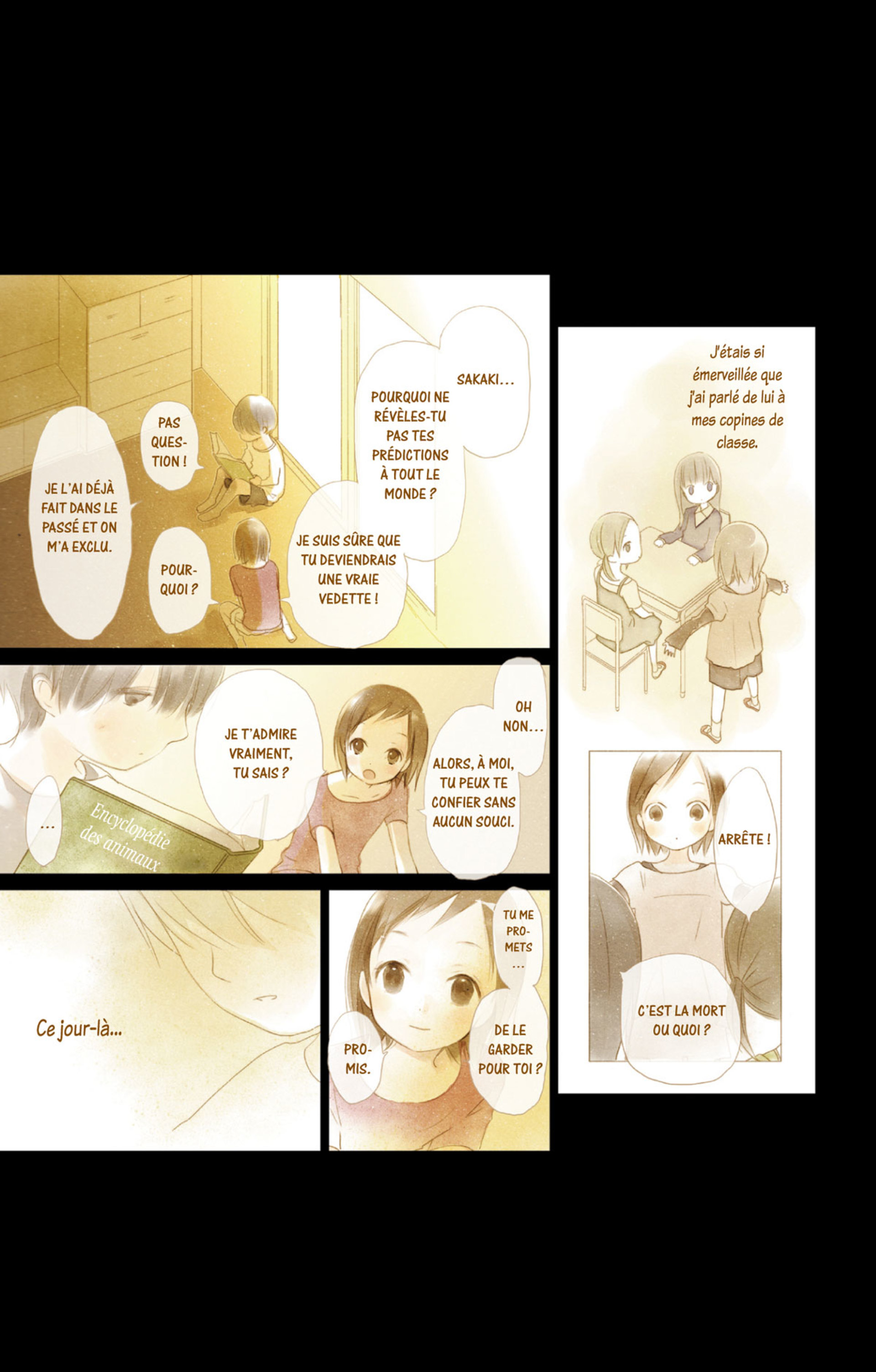 Un jeune enfant prédit la fin du monde ; la connaissance du futur vient troubler les sentiments du présent ; cinq jeunes filles découvrent qu’elles ont le même fiancé et deux lycéennes décédées reviennent sur Terre afin de comprendre ce qui les rend inséparables dans l’au-delà. Ayuko décline ici les sujets explorant les méandres de l’âme humaine, par le truchement du merveilleux.
